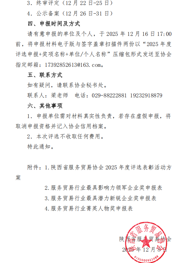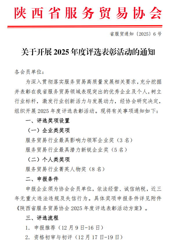 为深入贯彻落实服务贸易高质量发展相关要求,充分挖掘并表彰在我省服务贸易领域表现突出的优秀企业及个人,树立行业标杆,激发行业创新活力与发展动力,陕西省服务贸易协会经研究决定,组织开展2025年度评选表彰活动。现将有关事项通知如下: