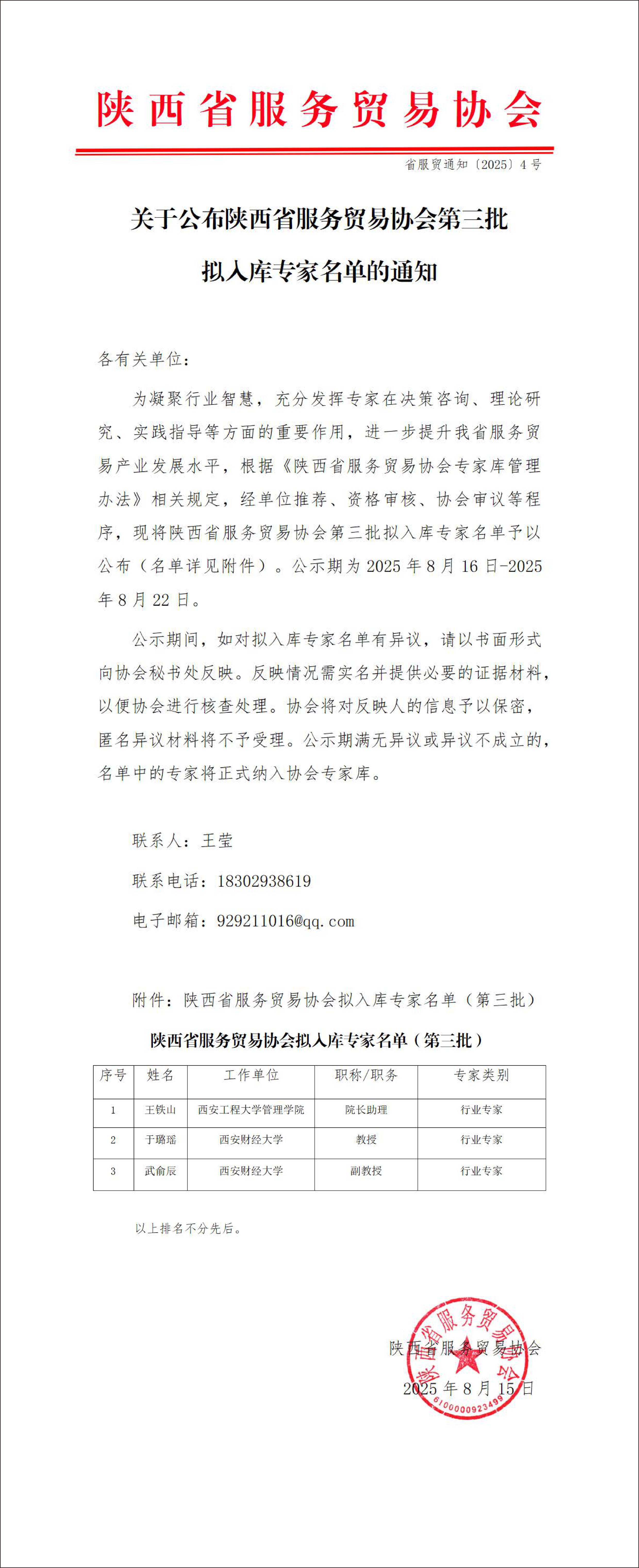 为汇聚行业智慧力量,提升服务贸易发展水平,陕西省服务贸易协会根据《专家库管理办法》,经严格推荐审核程序,现公示第三批拟入库专家名单(详见下图)。公示期为2025年8月16日至22日。