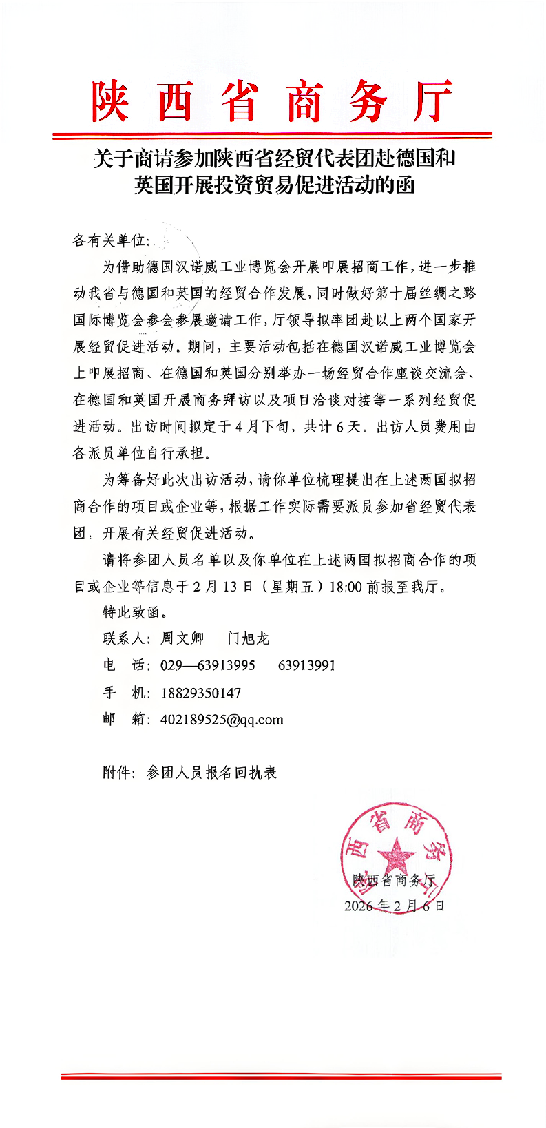 为借助德国汉诺威工业博览会这一国际性平台开展叩展招商,进一步推动我省与德国、英国的经贸合作,同时做好第十届丝绸之路国际博览会参会参展邀请工作,陕西省经贸代表团拟于4月下旬赴德国和英国开展为期6天的投资贸易促进活动。现诚邀各会员单位、社会企业积极参与,共同开拓欧洲市场!