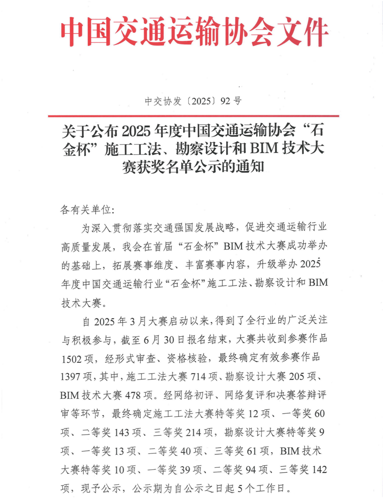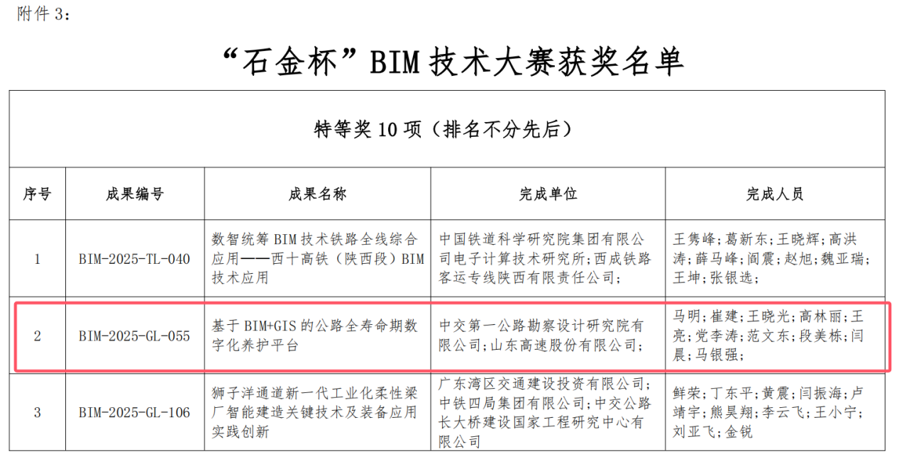近日,2025年度中国交通运输行业“石金杯”施工工法、勘察设计和BIM技术大赛获奖名单正式公示。一公院瑞通公司自主研发的“基于BIM+GIS的公路全寿命期数字化养护平台”从全国478项BIM技术参赛作品中脱颖而出,荣获大赛“特等奖”,成为全国获此殊荣的十项成果之一。